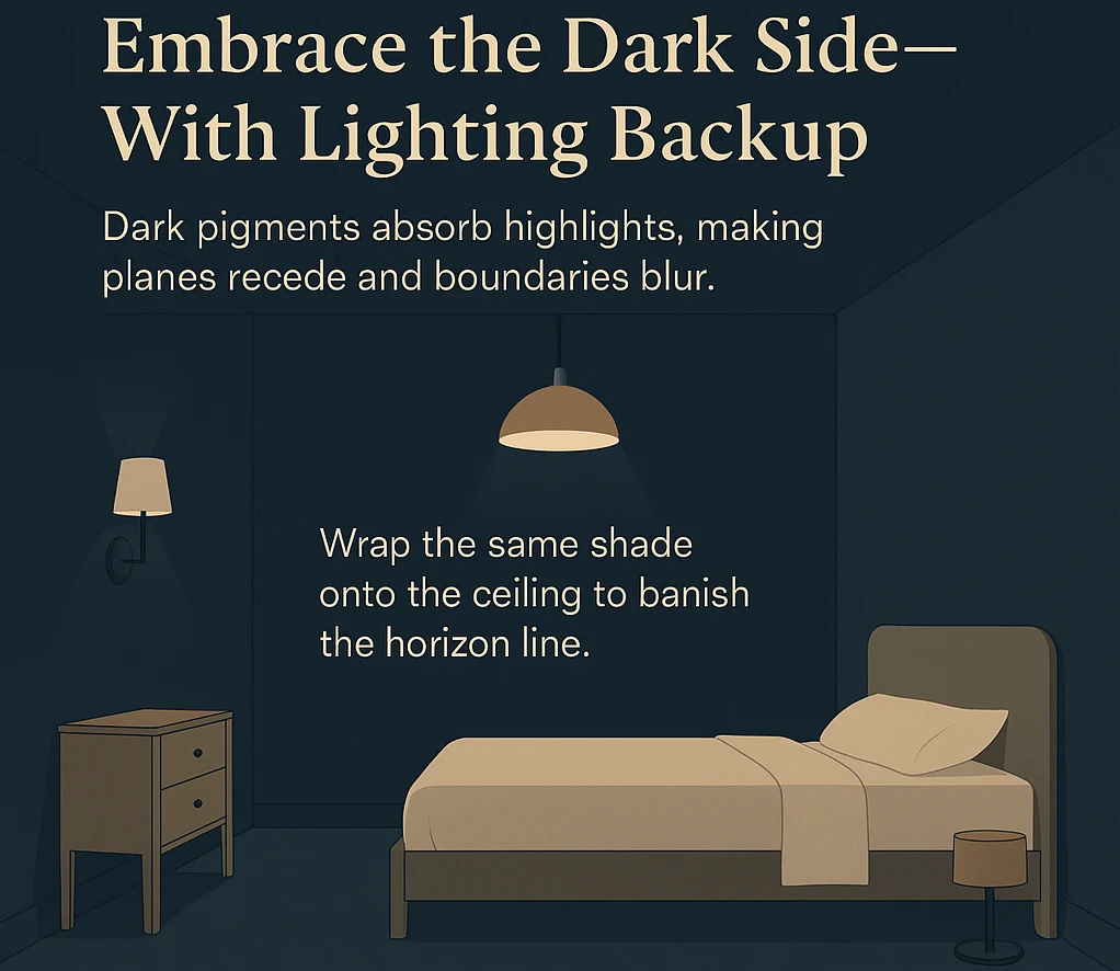 Deep hues absorb light instead of bouncing it, reducing glare and flattening shadows. That means fewer visible “edges,” more depth, and a mysterious boundary-blurring effect.