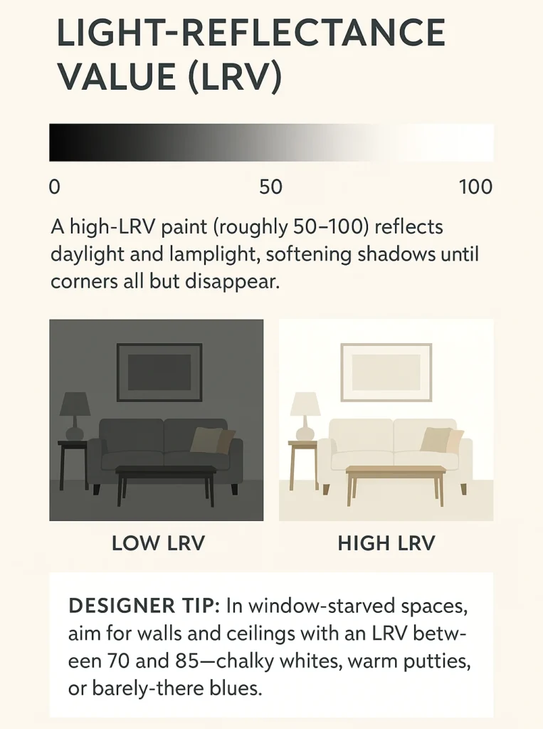 - Use high-LRV hues to reflect light and stretch space.