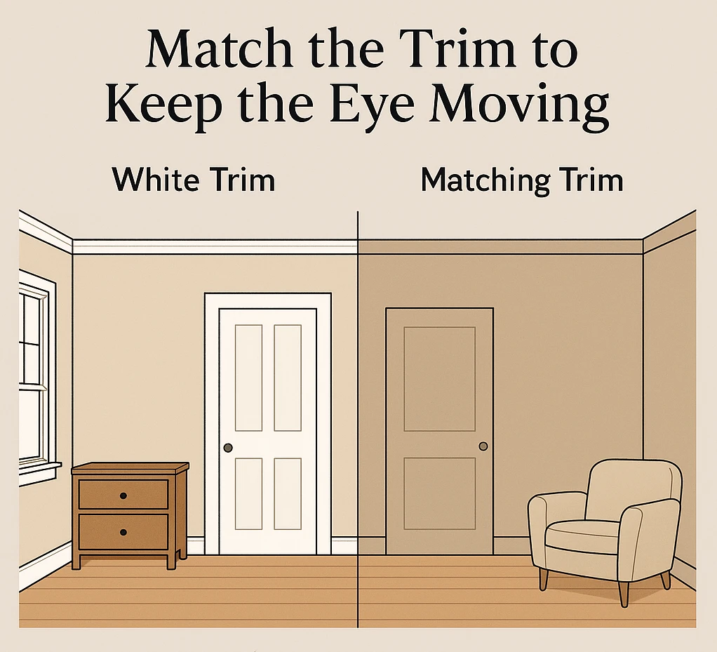 High-contrast white trim used to be a default, but in small rooms, it can chop up space and create visual clutter.