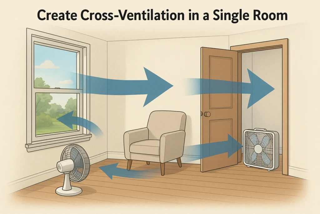 - Crack a window high and exhaust with a door fan for cross-breeze.