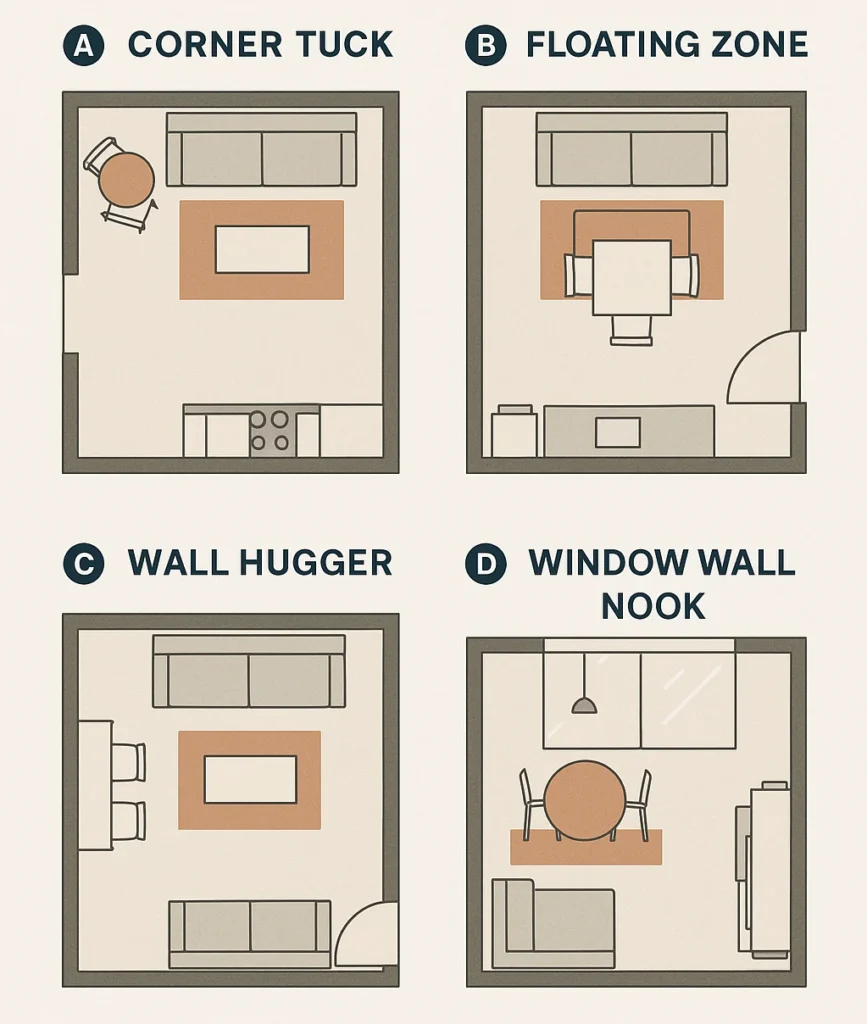 The best layouts weave dining in as a natural part of the room’s flow, not an awkward add-on. Here are four proven placement strategies that maximize space and style: