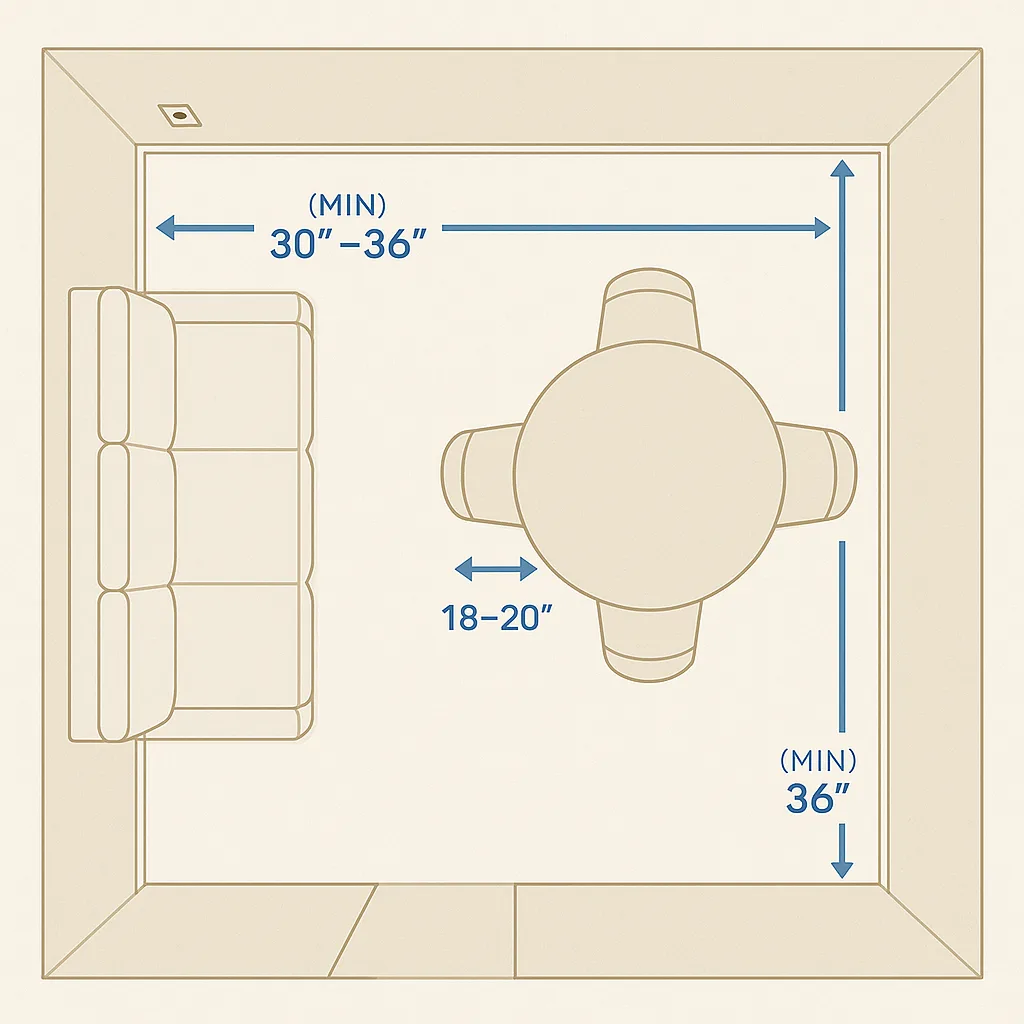 - Aim for a minimum 36-inch buffer between the edge of your table and any fixed piece of furniture (like a sofa back, wall, or media unit).