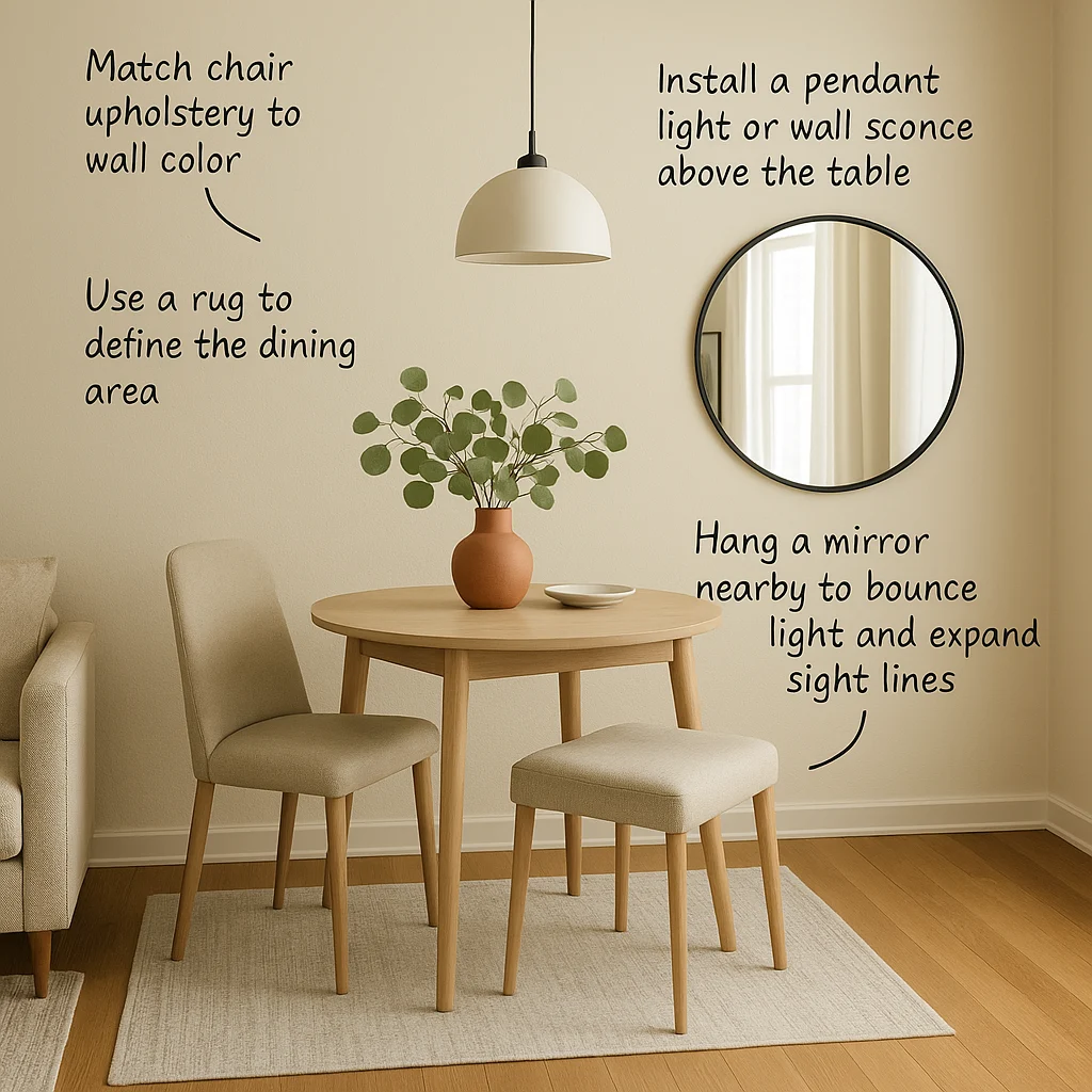Tuck a small round or square table into a corner with two chairs—just enough for daily meals or coffee chats. This setup works especially well next to: