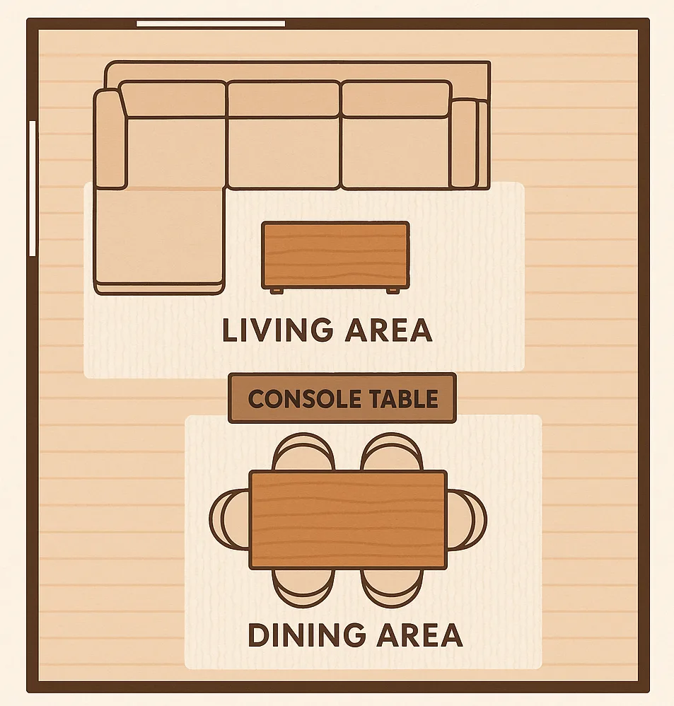 Bonus Tip: Add a console table behind the sofa. It visually reinforces the divide and gives you a place for lamps, trays, books, or baskets.