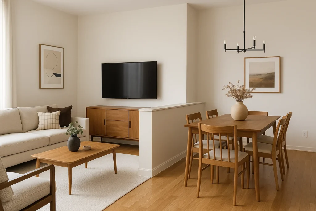 One of the most effective (and renter-friendly) tricks is to float the back of your sofa between the two areas. Instead of pushing it against a wall, let it “face” the living room while its back marks the start of the dining space.