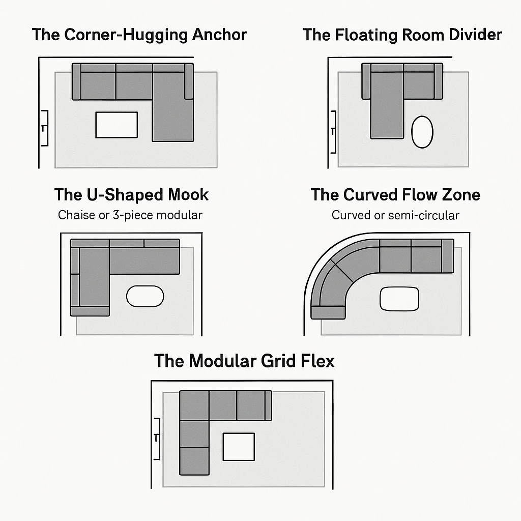 Below are five proven sectional layouts that work even in compact rooms, as small as 10 × 10 feet, complete with diagrams and design tips.