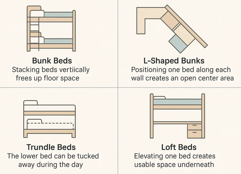Your bed layout will shape how the room feels and functions. Whether you’re trying to save space, give kids their own zones, or allow for flexible use, the right setup makes all the difference.
