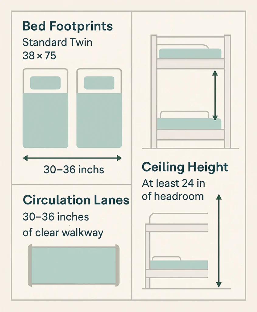 | Ceiling Height | At least 8 feet for top bunk safety |